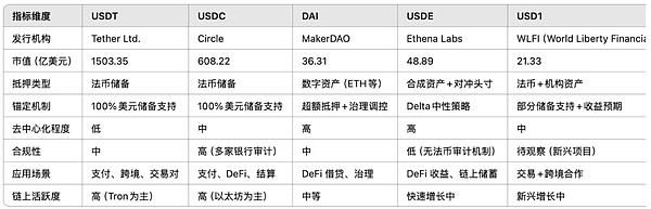 本节从机制结构、资产支持类型、流动性与应用场景、风险点等维度,对当前市值排名前五的主流稳定币(USDT、USDC、DAI、USDE、USD1)进行系统性分析对比。