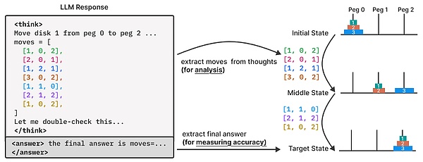 期间,他们通过谜题实验环境的构建,实现了对模型最终答案之外的深度解析,从而能够对其生成的推理轨迹(即“思考过程”)进行更精细的观测与分析。