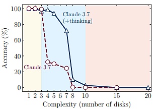 然而,由苹果公司六位研究人员组成的团队却对此提出了质疑。通过让模型解答各种谜题,研究团队发现 DeepSeek-R1、o3-mini 和 Claude-3.7-Sonnet-Thinking 这几款前沿大型推理模型在超过某一复杂度阈值之后,它们的准确率会出现全面崩溃。