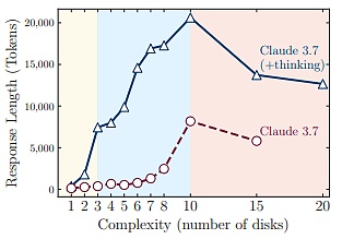 然而,对于更复杂的问题,这一趋势会发生变化——解决方案的准确性会随着思考的推进而提高,直至达到某个阈值。超过这个复杂度阈值,在“崩溃模式”下,模型的准确率为零。