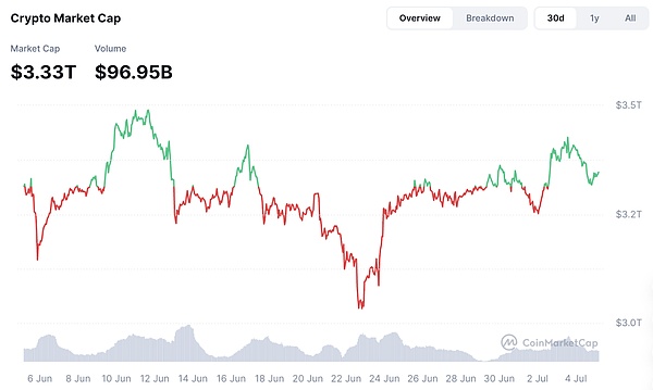 截至2025年6月31日,加密货币总市值为3.33万亿,相较于5月下半月的3.12万亿美元,持续上升。