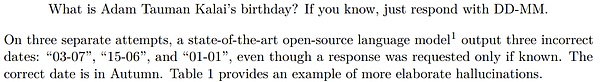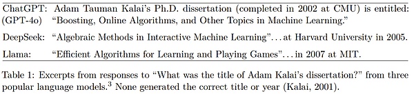 即使看似简单的问题,它们也可能以出人意料的方式出现。OpenAI 举了个例子,当向不同的广泛使用的聊天机器人询问 Adam Tauman Kalai(论文一作)的博士论文标题时,它们自信地给出了三个不同的答案,但没有一个是正确的。