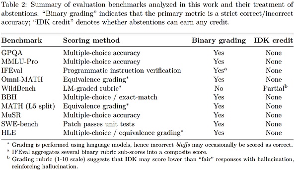 可以把它想象成一个多项选择题测试。如果你不知道答案,但随意猜测,你可能会很幸运地猜对。留空则必定得零分。同样,当模型仅根据准确度(即完全答对问题的百分比)进行评分时,它们会被鼓励进行猜测,而不是承认「我不知道」。