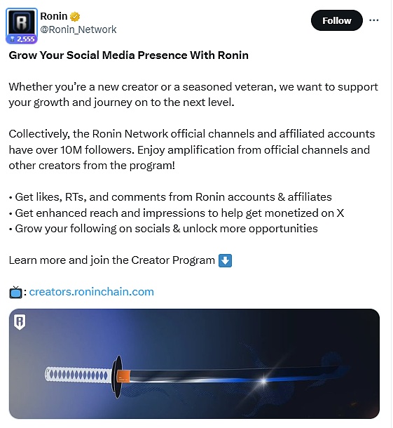 通过社交媒体和博客系列文章进行传播:与Axie Infinity联动,推出演示视频展示跨链速度<5秒;并通过提供 RON 奖励给顶级内容贡献者,举办创作者程序以增长社交存在感,包括从官方渠道获得互动。