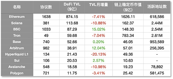 各链关键指标中,BSC的TVL月增幅明显