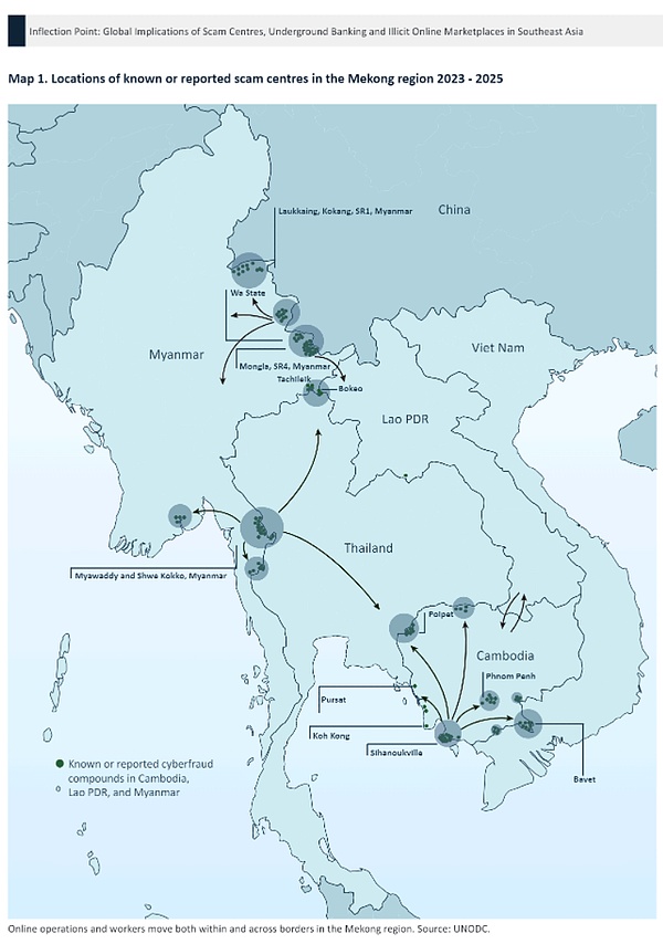 2023-2025年湄公河地区已知或已报告诈骗中心分布