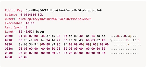 还有一种账号称为 PDA 账号,它是由智能合约派生的账号,主要用于存储智能合约数据,它的 Owner 是派生它的智能合约,例如:用于保存 Token 发行和持有信息的账号就是一种 PDA 账号,用 Solana Account 查看账号基本信息时可以看到它的 Owner 是 Token 智能合约 TokenkegQfeZyiNwAJbNbGKPFXCWuBvf9Ss623VQ5DA: