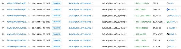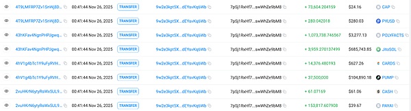 第一条主要路径涉及约 238 万美元等值资产,核心特征为“多层级扩散 + CEX 分散入金 + 多地址中转”。攻击者通过该地址将接收的多种代币(包括 PAYAI、CASH、CARDS、JitoSOL、POLYFACTS、PUMP、PYUSD、CAP)兑换为 SOL。其中,PUMP 是被转移至 7E4eNkK… 后再兑换为 SOL。