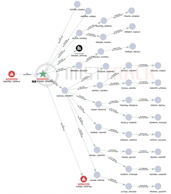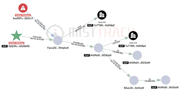 5,742 SOL 转移至 FiywJZ2Z…,该地址同时收到了被 MistTrack 标记为“Phishing”的其他钓鱼事件地址的 2772.8 SOL。