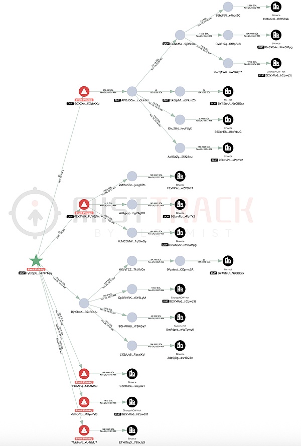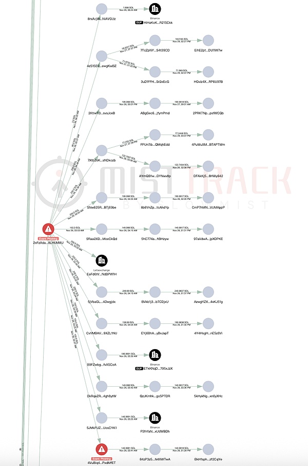 6)2,142 SOL 转移至 2xFzAda…,352 SOL 转入 Binance 平台,200 SOL 转入 Letsexchange 平台,剩余资金分散并停留在约 11 个中转地址。