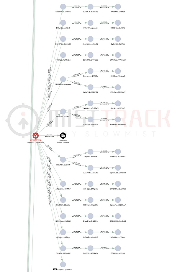 根据链上追踪 & 反洗钱工具 MistTrack 对受害者地址 9w2e3kpt5XUQXLdGb51nRWZoh4JFs6FL7TdEYsvKq6Wb 的分析,本次攻击资金转移路径复杂,攻击者主要通过两个核心地址对资产分流:BaBcXDg…(流向 1)、7pSj1R…(流向 2)。