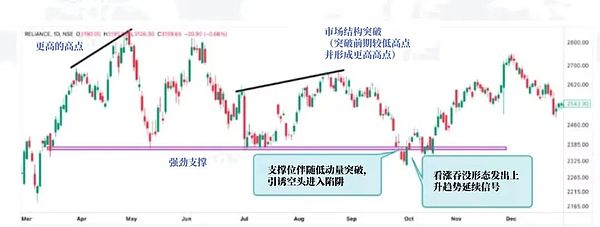 回踩确认支撑有效:价格反转后若能回踩并站稳于原支撑位(现已转为阻力位)上方,可确认是陷阱而非有效破位。