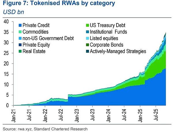 代币化实物资产市场正在加速扩张。渣打银行预测,到2028年,非稳定币RWA的价值可能攀升至2万亿美元,主要由代币化股票、基金和其他传统金融工具向区块链迁移推动。