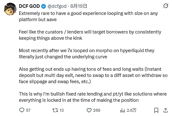 借款人确实喜欢确定性,但大多数链上借贷并非家庭抵押贷款,而是涉及杠杆、基差交易、规避清算、抵押品循环和策略性资产负债表管理。
