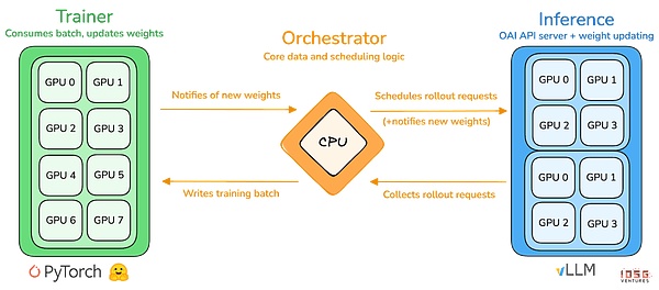 完全异步(True Asynchrony):prime-rl 摒弃传统 PPO 的同步范式,不等待慢节点、无需批次对齐,使任意数量与性能的 GPU 都能随时接入,奠定去中心化 RL 的可行性。