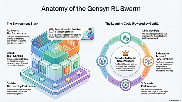 Solvers(执行者): 负责本地模型推理与 Rollout 生成,节点异构无碍。Gensyn 在本地集成高吞吐推理引擎(如 CodeZero),可输出完整轨迹而非仅答案。