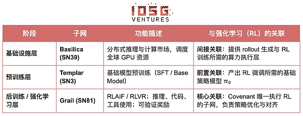 Bittensor 生态中的 Covenant AI 则通过 SN3 Templar、SN39 Basilica 与 SN81 Grail 构建了从预训练到 RL 后训练的垂直一体化流水线。其中,SN3 Templar 负责基础模型的预训练,SN39 Basilica 提供分布式算力市场,SN81 Grail 则作为面向 RL 后训练的“可验证推理层”,承载 RLHF / RLAIF 的核心流程,完成从基础模型到对齐策略的闭环优化。