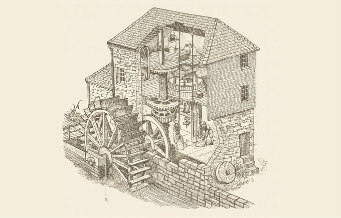 一座依靠水车驱动的磨坊。水力动力虽然强劲,但稳定性差,且受地域和季节限制,磨坊只能建在河流沿岸。