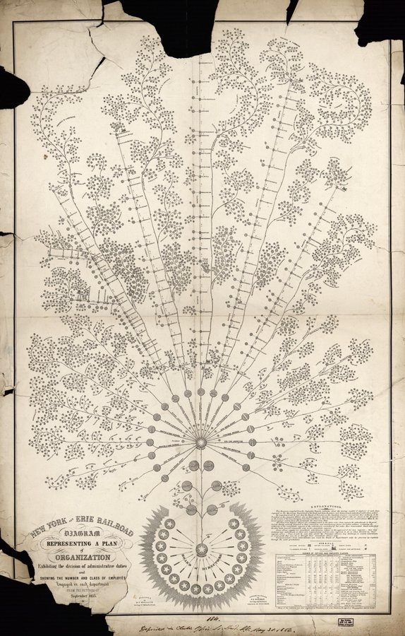 1855年纽约-伊利铁路公司的组织架构图。现代企业制度与组织架构图,正是伴随着铁路公司的兴起而发展起来的。铁路公司是最早需要协调数千名员工、跨地域开展业务的企业形态。
