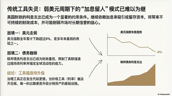 目前的宏观天平正处于一个微妙的时间节点:美元正步入一个由多重因素交织驱动的贬值周期。按照教科书式的逻辑,为了对冲本币走弱带来的资本外逃,美联储本应通过维持高利率来锚定全球流动性,但在联邦债务利息支出已然成为财政重担的今天,这种“靠涨息留人”的传统手段正变得空前昂贵且难以为继。华尔街的精英们敏锐地察觉到,治理工具正在发生代际更替——当价格工具(利率)触及天花板,唯一的出路便是升级分销资产的基础设施。