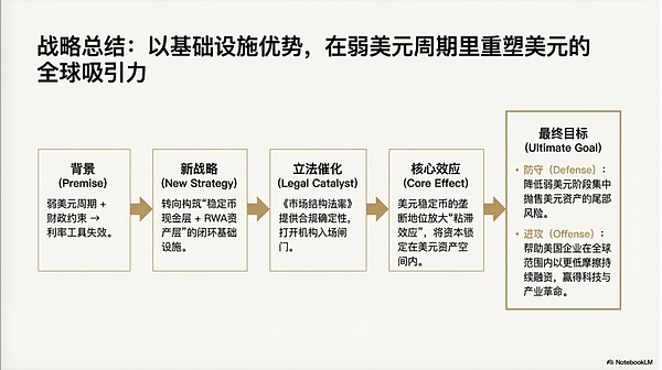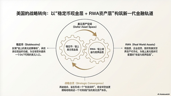 与不少人的理解不同,《市场结构法案》并不是要规范野蛮生长了十多年的加密市场,而是要打开美国 RWA 资产铸造的阀门,让稳定币与RWA 合流,形成一个“先发闭环”:稳定币提供链上可结算的“美元现金层”,RWA提供链上可配置的“收益与抵押品层”,两者共同把全球资金更顺畅地吸纳进一个可持续扩张的“美元资产空间”。在弱美元周期里,这个闭环关键价值不在于让美元立刻转强,而在于通过“相对粘滞效应”降低投资者集中抛售美元与美债的尾部风险,把部分“离场压力”转化为体系内的换仓与再配置;同时,在科技革命与产业升级的关键阶段,它为美国及美国企业提供一种跨时区、可规模化的全球融资与资产分销机制,从而在不必完全依赖抬高国债收益率来留住资本的情况下,继续从全世界吸收资金、扩展资产负债表与创新投入。