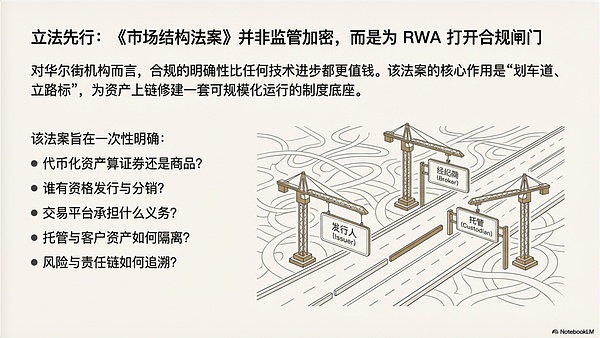 很多人把《市场结构法案》想成“给加密市场亮绿灯”,这完全是误读。这个法案其实是在为“资产上链”修一套可规模化运行的制度底座:把代币化资产究竟归谁管、算什么属性、谁能发行、谁能交易撮合、经纪与托管应承担什么义务、客户资产如何隔离、信息披露与风控标准如何落地等关键环节一次性“划车道、立路标”。对华尔街机构而言,这种明确性比任何技术进步都更值钱——当合规边界从灰色变成可预期,法律不确定性成本就会显著下降,资本、产品与业务流程才敢迁移到链上;而一旦机构化供给开始稳定涌入,链上市场就不再只是零散试验,而有机会形成可持续的流动性与信用积累,最终为稳定币与RWA的闭环扩张提供制度保障。