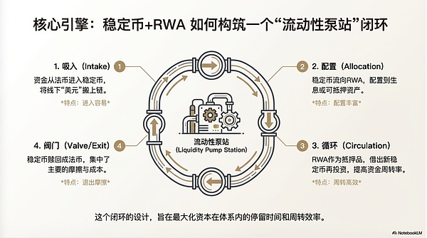 一旦把稳定币与 RWA 放在同一张图里,你会发现它们的组合更像一座“流动性泵站”,而不是两种彼此独立的金融创新。泵站的最小结构其实非常朴素:资金先从法币或银行存款进入稳定币,把线下的“美元”搬上链,变成随时可结算的“链上美元现金”;随后再从稳定币流向 RWA,把这笔链上现金配置到能产生收益、或至少能充当抵押品的资产上;接着,资产层开始发挥它的“周转”属性——RWA不只是拿着收息那么简单,它可以被抵押,借出新的稳定币,再去买入更多资产或参与其他配置,这就把原本线性的一次投资,变成了一个可循环的资金回路;最后,真正的摩擦集中在“退出”环节:稳定币要赎回成法币,往往要穿过银行体系、合规审查与通道成本,这条路并非堵死,但足够狭窄,足够昂贵,因此在很多场景里,资金更倾向于在链上体系内部换仓而不是立刻离场。把这四步串起来,闭环就出现了:进入容易、配置丰富、周转高效、退出摩擦集中——这就是泵站的基本形态。
