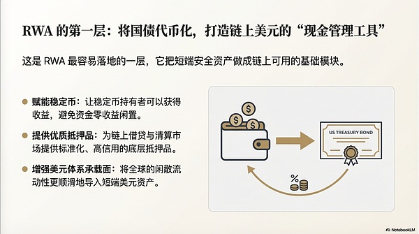 这就是稳定币与RWA合流的直观意义。稳定币可以理解为“链上的美元结算筹码”:它不是美国央行发行的货币,但在链上交易与跨平台清算中,承担了类似现金的功能;而RWA则是把国债、货币市场基金份额、私募信贷、应收账款乃至部分股权类权益,用合规结构与技术手段表达成可转让、可拆分、可结算的“数字凭证”。