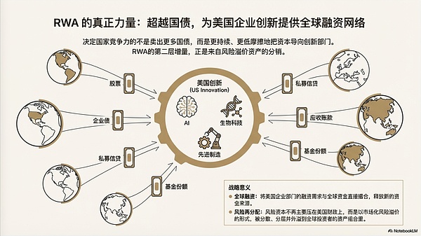真正的第二层增量,来自风险溢价资产的分销:股票、企业债、私募信贷、应收账款、基金份额,乃至某些结构化产品与股权类权益。这一层更贴近“企业融资”与“风险定价”,因为它不再是把国债收益搬上链,而是把美国企业部门的融资需求与全球资金更直接地撮合起来——把原本只对少数机构开放、手续繁复、交易不连续的资产池,拆得更细、卖得更远、结算得更快,从而释放新的资金来源。更重要的是,它还隐含着一种风险再分配:当更多资金通过链上RWA进入美国企业资产与信用资产,美国创新与扩张所需的风险资本就不再主要压在联邦政府资产负债表上,也不必通过“提高国债利率”来硬拉资金,而是以市场化的风险溢价形式,被分散、分层并外溢到全球投资者的资产组合里——收益更诱人,风险也更真实,但风险的承受者从“美国财政”更多转移为“全球资本”。这正是RWA在科技革命窗口期最关键的含义:它把美元从单纯的货币与国债体系,推进到一个更具扩张性的“全球融资与风险承载网络”,让美国企业可以在全球范围内持续吸纳资本,同时把创新的不确定性通过金融结构更广泛地分摊出去。