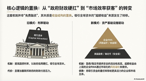 必须把一个容易被误读的点说清楚:这套机制并不是“不付息的全球集资”,也不是美国政府找到了“免费融资”的秘方。所谓“不靠抬高利率来留人”,绝非指美联储可以违背经济规律随意降息,也不是说资产不再支付收益。其核心逻辑在于收益结构的置换。在 RWA 体系中,国债与稳定币更多地回归到“基础设施”与“清算底层”的角色,它们提供了安全的流动性保障。而吸引全球资本驻留的“超额收益”,则更多由上层的 RWA(如私募信贷、风险资产)通过市场化的风险溢价来承接。这意味着,美国可以维持一个相对适度的国债利率(从而减轻财政付息压力),而将吸引资金的重任转移给更具活力的企业和市场主体。这种由“政府财政硬扛”向“市场效率获客”的重心漂移,才是弱美元周期下美国保持金融霸权的一个大胆试验。