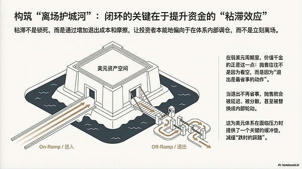 闭环一旦跑起来,最有意思、也最容易被误解的部分,其实不是“钱怎么进来”,而是“钱为什么不那么容易出去”。这里的关键词叫粘滞效应。但必须先把话说清楚:粘滞不是锁死,更不是某种阴谋论式的“囚禁资金”。它更像资产配置里的一个常识——当退出成本上升、再进入成本也不低时,投资者在做再平衡(rebalancing)时会本能地偏向“少走那扇门”。哪怕你对某个市场没那么乐观,只要彻底离场的摩擦足够大,你也更可能选择在体系内部调仓:从高风险换到低风险,从长久期换到短久期,从波动资产换到现金管理,而不是马上把资金抽回本币体系重新开始。摩擦改变的不是“能不能做”,而是“多快做、做多少、在什么情境下做”。弱美元周期里最值钱的恰恰是这点:抛售往往不是因为看空本身,而是因为“退出是最省事的动作”。当退出不再省事,抛售就会被延迟、被分散,甚至被替换成内部轮动。