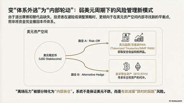 因此,在弱美元预期下,这种单极结构会把资金更强地推向“体系内对冲”而不是“体系外逃”。典型的轮动路径是:一部分资金从稳定币闲置状态进入美元RWA,尤其是国债/货基类资产,获取短端收益并作为更稳的担保品;另一部分资金则流向比特币、以太坊等数字原生资产,承担更高波动、也提供某种“非主权资产”的对冲想象。你会发现,这听上去像两种完全不同的风险偏好,但在资产配置层面它们可以同时存在:RWA提供收益与抵押品的稳定性,BTC/ETH提供对冲与弹性,二者都不需要离开链上美元体系。于是,“离场压力”被部分转化为“内部换仓”:投资者并没有把美元资产大规模抛给外部世界,而是在美元资产空间内部寻找新的均衡点。这正是闭环在弱美元周期里对美国最有战略价值的一点——它不是保证美元不跌,而是减缓“跌时的踩踏”。