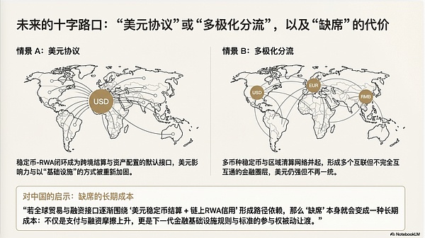 这当然不是 RWA 的终局。未来的链上世界大概率会在“美元协议”与“多极化分流”之间摆动:情景A是美元闭环先发,稳定币—RWA逐步成为跨境结算、资产配置与抵押融资的默认接口,美元资产空间因此进一步外扩,美元影响力以“基础设施”而非单纯“汇率强弱”的方式被重新加固;情景B则是监管与地缘政治推动分流,多币种稳定币、存款代币以及区域清算网络并起,形成多个互联但不完全互通的金融圈层,美元仍强但不再一统。对中国而言,短期的强监管确能守住金融稳定与资本项目管理,但若全球贸易与融资接口逐渐围绕“美元稳定币结算 + 链上RWA信用”形成路径依赖,那么“缺席”本身就会变成一种长期成本:不仅是支付与融资摩擦上升,更是下一代金融基础设施规则与标准的参与权被动让渡。这个成本有多高,那只有天知道。