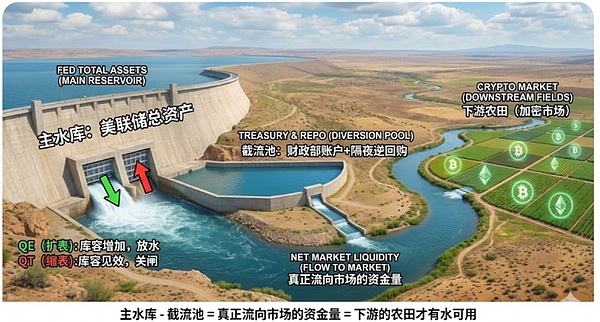 主水库- 截流池 = 真正流向市场的资金量 = 下游的农田(加密市场)才有水可用。