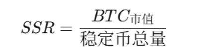 2、比特币市值与稳定币总量的比率:英文全称 Stablecoin Supply Ratio你会发现这个和1的差异就在于,一个对应加密货币全场总市值,一个对应比特币市值,然后分子分母对调了下,公式如下: