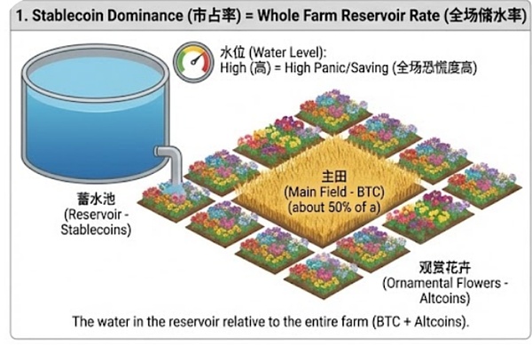 1“稳定币市占率”好比是“全场储水率”=蓄水池相对于整片农场(BTC+所有山寨币)的积蓄程度——衡量全场恐慌度。