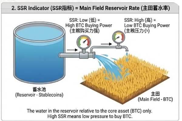 此时,SSR 指标 就像是专门针对‘主粮’的压力表。如果 市占率指数很高(水多)但 SSR 也很高(对主粮的压力小),说明农户虽然存了钱,但并不打算买比特币,而是去炒作山寨币了。只有当两个指标同步显示水多、压力大时,比特币的上涨才是最坚实的。