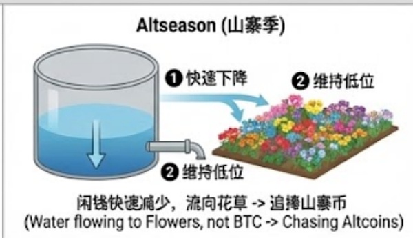 当稳定币市占率指数告诉我们蓄水池水位很高时,我们并不确定这些水会用来浇灌主粮(BTC)还是花卉(山寨币)。