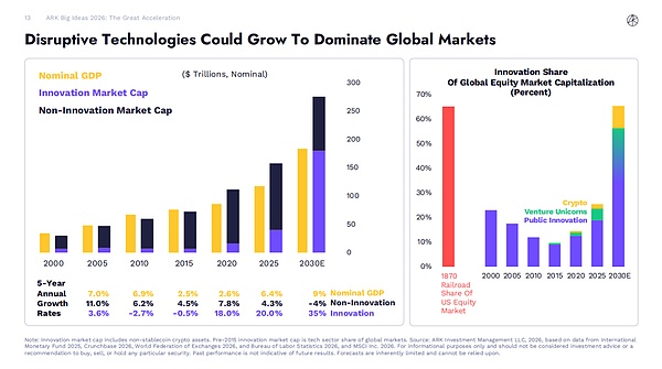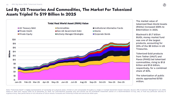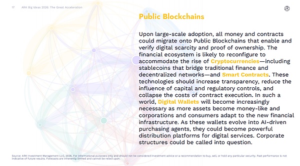 因此,我们结合 2025 & 2026 Big Ideas,来理清在 ARK Invest 未来趋势下,“公共区块链”的定位到底在哪?在这之后,我们编译了 《2026 Big Ideas》有关发展总览部分,以及公共区块链的部分:比特币、代币化资产、DeFi 应用,来看区块链和未来金融未来的趋势,以及数据、场景、落地。