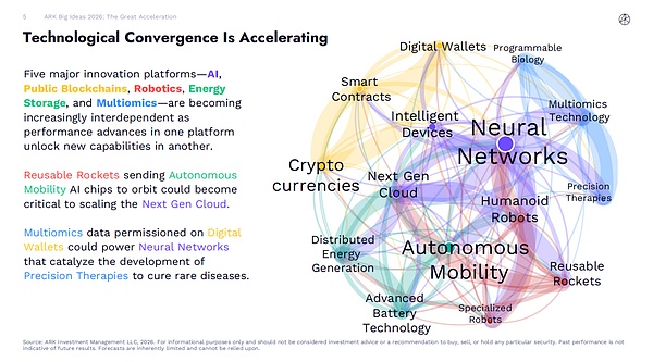 五大创新平台 —— 人工智能、公共区块链、机器人技术、能源存储和多组学技术 —— 正变得日益相互依赖。一个平台的性能提升将为另一个平台解锁新能力:可重复使用火箭将自主移动人工智能芯片送入轨道,可能成为下一代云计算规模化发展的关键;数字钱包中授权的多组学数据可驱动神经网络,推动精准疗法研发以治愈罕见疾病。