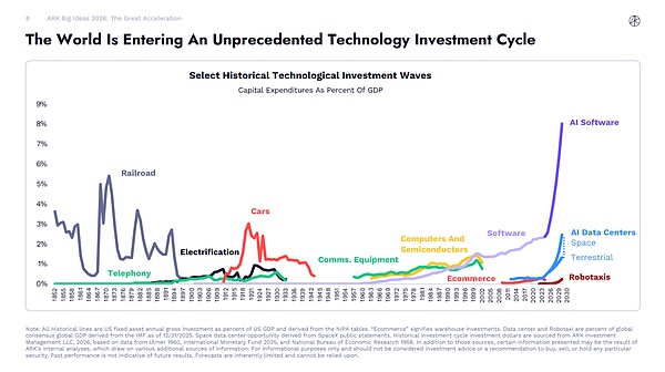 技术的加速融合以及对其需求的增长,必然会使得全球投资进入一个新的阶段。图表中,表达了历史上技术范式转变已引发 GDP 增长的结构性变化,涉及铁路、电气化、电话、汽车、计算机与半导体、软件、电子商务、地面通信设备、人工智能软件、人工智能数据中心、太空、自动驾驶出租车等领域。