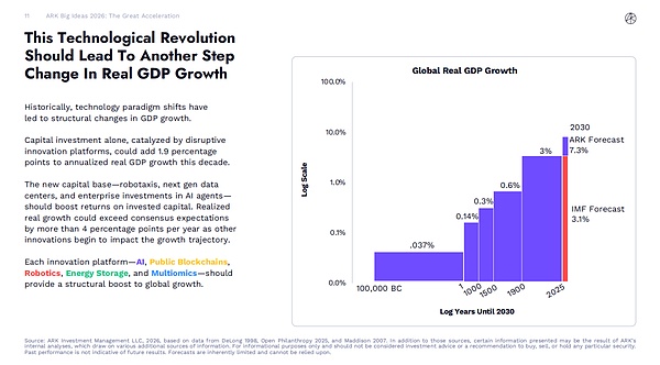 在《贝莱德 2026 全球展望:AI 重构下的非常态投资范式》一文中,科技创新对于全球经济增长的预测与 ARK Invest 一致: