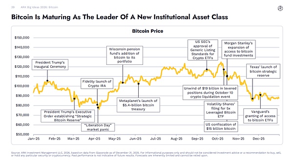 关键事件包括:美国证监会(SEC)批准加密货币 ETF 通用上市标准、摩根士丹利扩大比特币基金投资渠道、威斯康星州养老金将比特币纳入投资组合、特朗普总统就职典礼、得克萨斯州推出比特币战略储备、富达(Fidelity)推出加密货币个人退休账户(IRA)、10 月 10 日加密货币清算事件中 190 亿美元杠杆头寸平仓、Metaplanet 推出 54 亿美元比特币国库、波动率 Shares 申请 5 倍杠杆比特币 ETF、特朗普总统签署行政命令建立 "战略比特币储备"、先锋集团(Vanguard)允许投资比特币 ETF、"解放日" 市场恐慌、美国没收 150 亿美元比特币等。