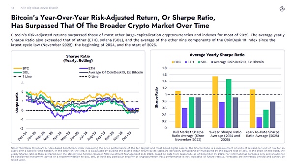 随着时间的推移,2025 年大部分时间里,比特币的年化风险调整后回报(夏普比率)已超过更广泛的加密货币市场。自最近一轮周期低点(2022 年 11 月)、2024 年初和 2025 年初以来,其年均夏普比率也超过了以太坊(ETH)、索拉纳(SOL)以及 CoinDesk 10 指数中其他九个成分股的平均值。