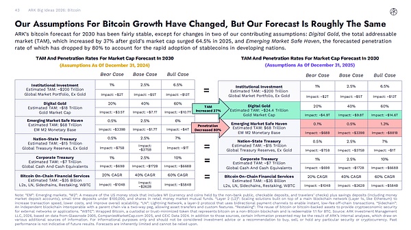 ARK 对 2030 年比特币的预测相对稳定,但有两项关键假设发生了变化:"数字黄金" 的总潜在市场(TAM)在 2025 年黄金市值飙升 64.5% 后增长了 37%;而 "新兴市场避险资产" 的预测渗透率下降了 80%,以反映稳定币在发展中国家的快速采用。