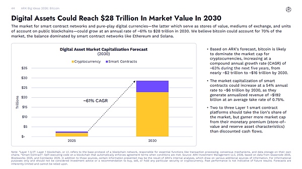 ARK Invest 表示:除了比特币之外,智能合约网络和原生数字货币的市场可能以每年约 61% 的速度增长,到 2030 年达到 28 万亿美元。