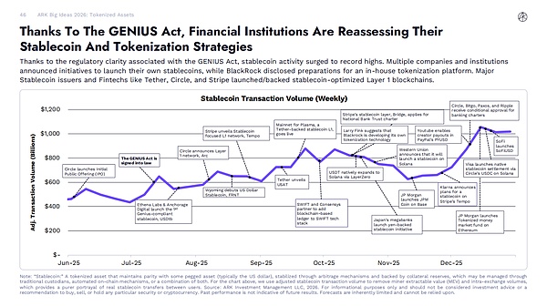 注:上图中,我们使用调整后的稳定币交易量,以剔除矿工可提取价值(MEV)和交易所内交易量,从而更纯粹地反映用户之间的实际稳定币转移。数值代表 30 天移动平均交易量,按月采样。因此,这些数据可能与日历月总数存在差异。来源:ARK 投资管理有限责任公司,2026 年,基于 Artemis Analytics 2025 年 12 月 31 日的数据。仅供参考,不构成投资建议或买卖任何特定证券或加密货币的推荐。过往业绩不代表未来结果。预测本身存在局限性,不应过分依赖。