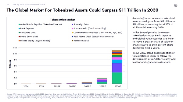来源:ARK 投资管理有限责任公司,2026 年,基于联合国贸易和发展会议 2025 年、Avalos 2025 年和 Ocorian 2025 年 12 月 31 日的数据。此外,部分呈现的信息可能来自 ARK 的内部分析,该分析借鉴了多种补充信息来源。仅供参考,不构成投资建议或买卖任何特定证券或加密货币的推荐。过往业绩不代表未来结果。预测本身存在局限性,不应过分依赖。