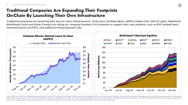 (图表:Coinbase 在 Base 上的比特币支持贷款趋势图(2024 年 8 月 - 2025 年 12 月)、Robinhood 代币化股票市值趋势图(2025 年 6 月 - 12 月))
