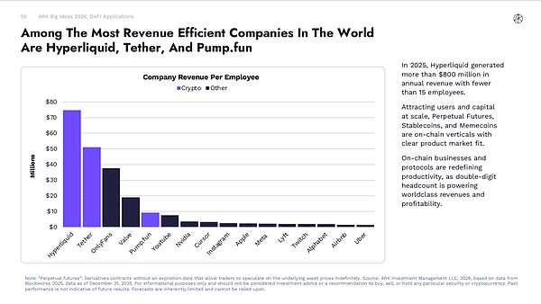 2025 年,Hyperliquid 凭借不到 15 名员工创造了超过 8 亿美元的年收入。永续期货、稳定币和模因币(Memecoins)正以规模化方式吸引用户和资金,是具有明确产品市场契合度的链上垂直领域。链上企业和协议正在重新定义生产力 —— 两位数的员工规模就能创造世界级的收入和盈利能力。在 Hyperliquid 的引领下,去中心化金融(DeFi)衍生品正在抢占币安(Binance)的永续期货市场份额。